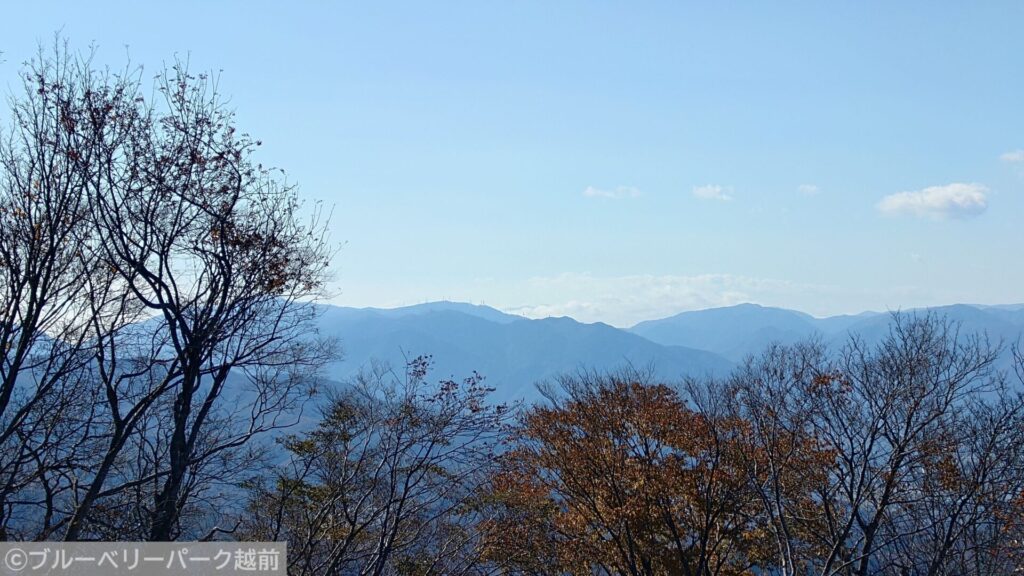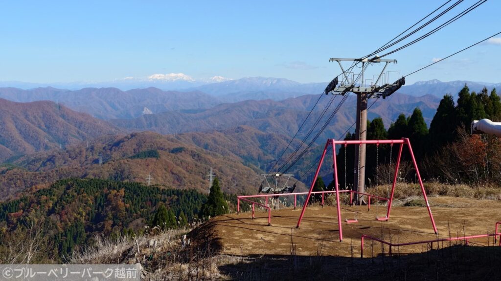 山頂手前には、赤いブランコに揺られながら白山を望むことのできる展望スポットがあり、さらに、山頂からは日本海や敦賀半島、敦賀三山などの山々を見渡せる絶景が広がります。