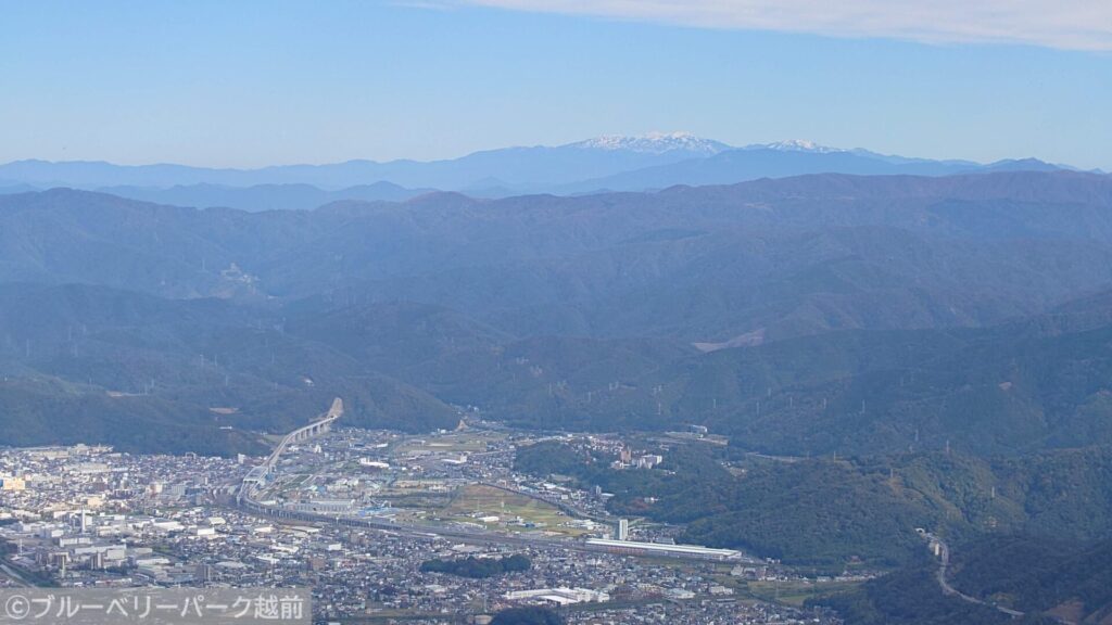 山頂ではベンチに腰掛けながら、福井平野や日本海、白山の眺望を楽しむことができます。