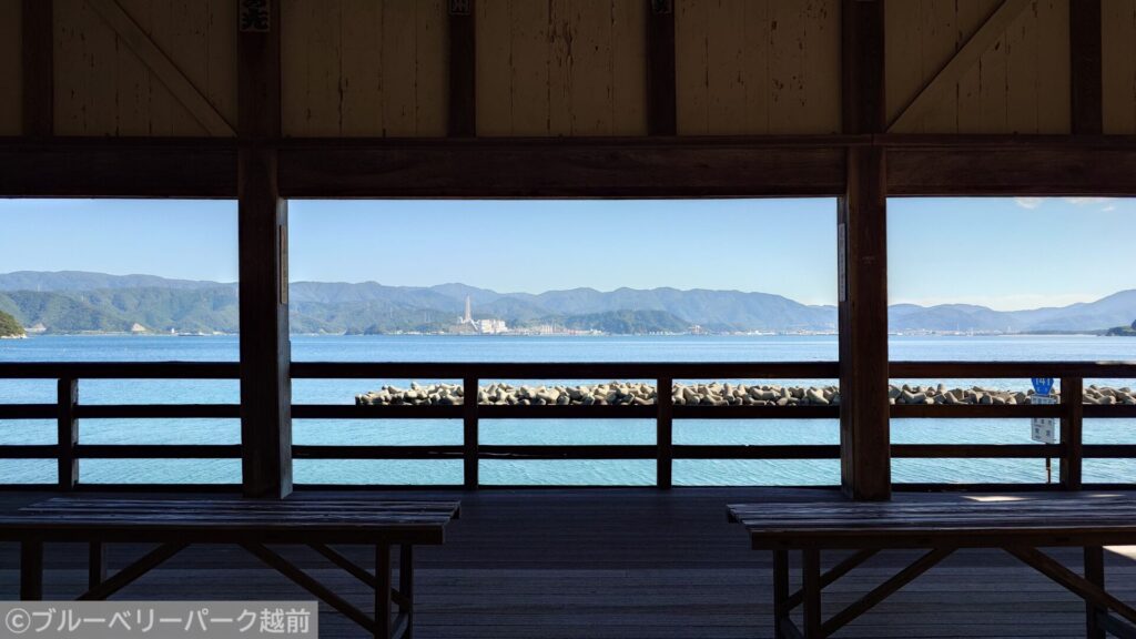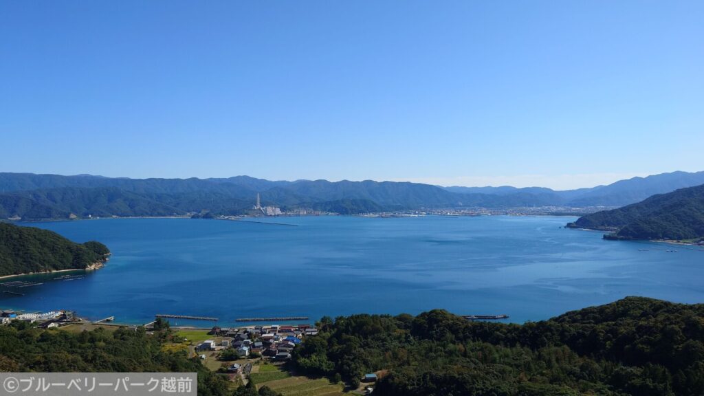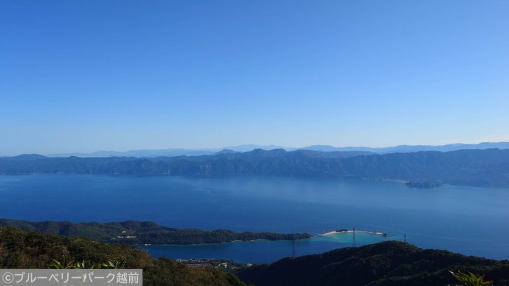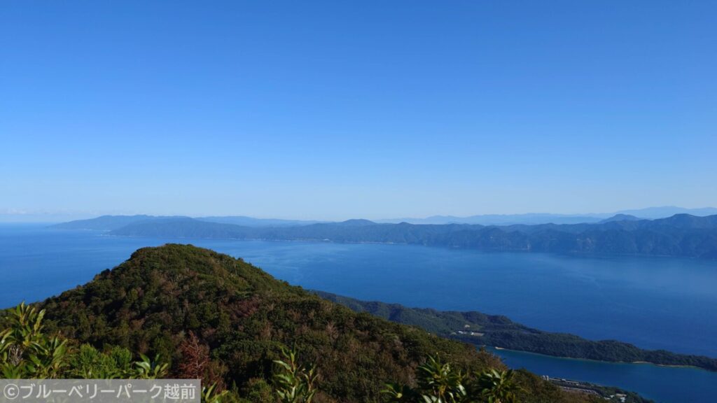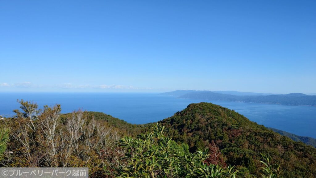 カモシカ台からは、絶景が広がります。眼前には日本海敦賀湾のほか、海越しの白山鬼ヶ岳、日野山部子山を望むことができ、見通しが良ければ福井平野も見えます。