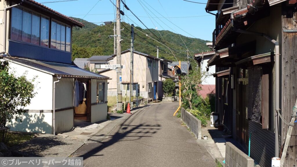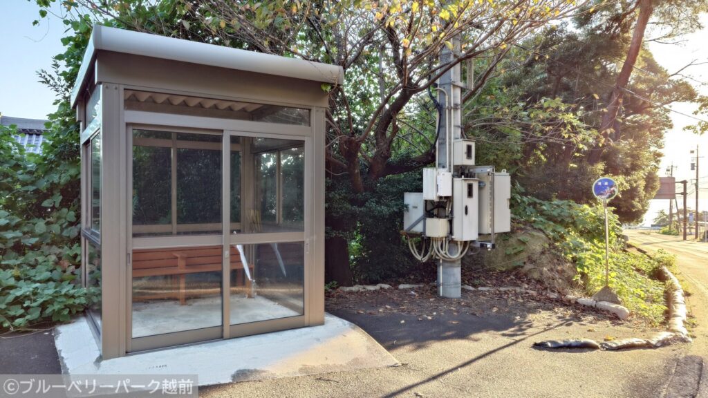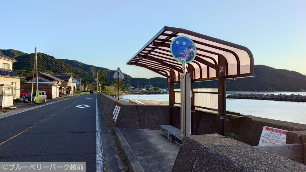 敦賀市の市街地から福井県道141号を通って敦賀半島の先端に向かうと、浦底の集落に入ってすぐのところに、敦賀市コミュニティバス 常宮線の「浦底」停留所があります。
