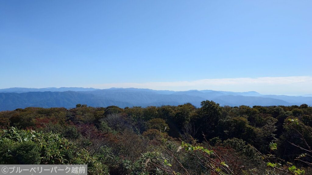 北側方面のカモシカ台や蠑螺ヶ岳をはじめ、海越しの白山鬼ヶ岳日野山部子山を望むことができ、見通しが良ければ福井平野も見えます。また、南東方面には伊吹山もあります。