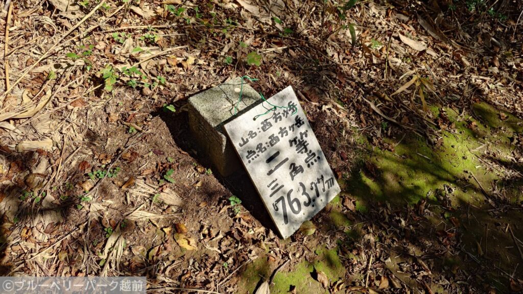 西方ヶ岳の山頂手前に分岐があり、右手に50mほど進んだところに三角点があります。左手に進むと、山頂に到着です。