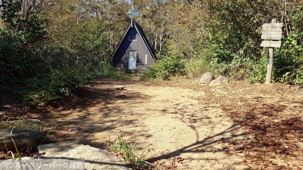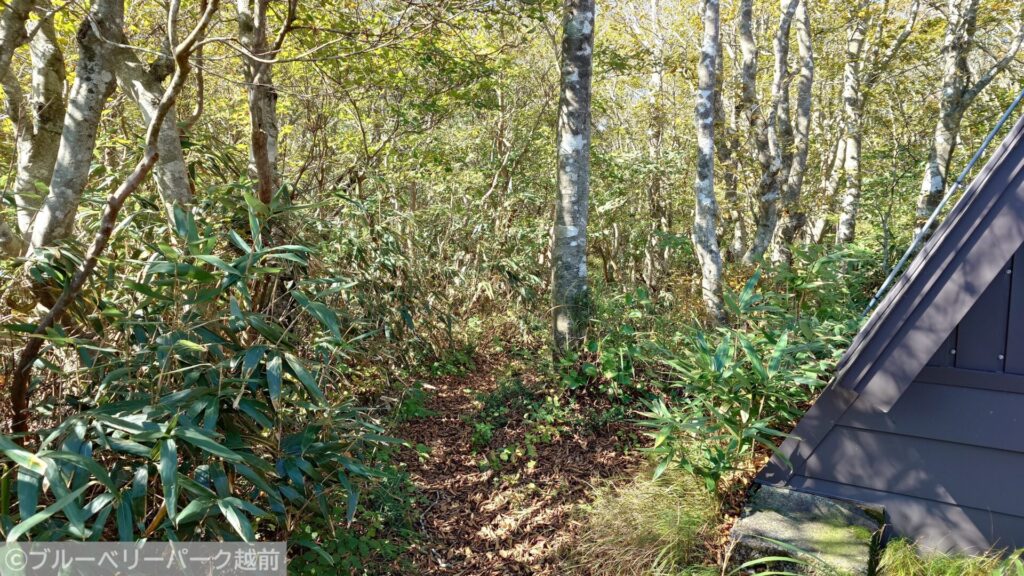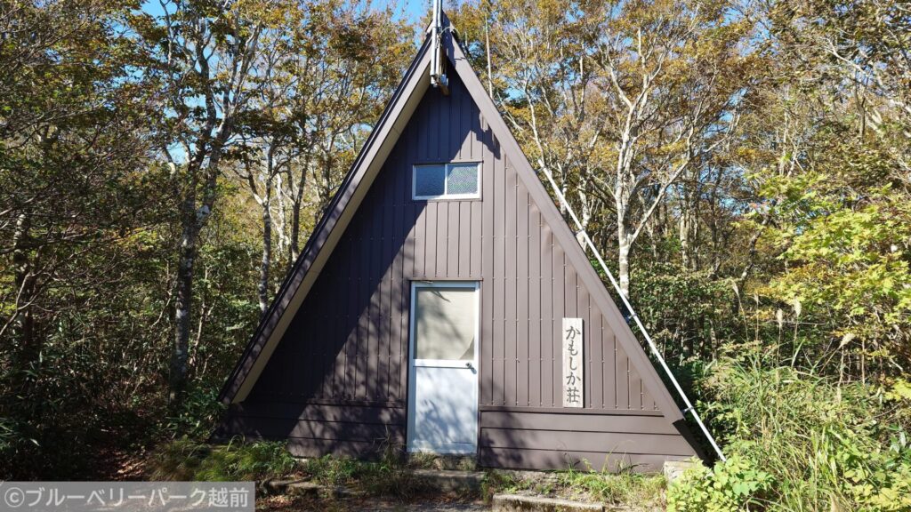 かもしか荘の左奥に、三角点やカモシカ台、蠑螺ヶ岳に向かう登山道が続いています。
